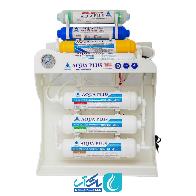 دستگاه تصفیه آب ده مرحله ای خانگی آکوا پلاس (PI 8000) AQUA PLUS RO8 8Stage باسیستم اسمز معکوس RO (ساخت کشور تایوان) در طی 8 مرحله توسط 8 فیلتر آب را تصفیه میکند.